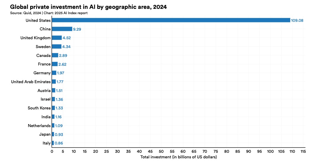日本がAI分野で大きく遅れているという認識は今更の感がある。現実を見れば、世界のAI技術開発では米国と中国が圧倒的に先頭を走る。英独仏といった西欧諸国は必死で先頭を追いかけるが、日本の立ち位置は上位グループから周回遅れ、いや5〜6周遅れと言って良い。日本のAIへの民間投資額は米国の127分の1、中国の11分の1、英国の5分の1にすぎない/1(下図参照)。要するに、日本はこの分野に金を投じていない。英語で言えば「non-starter/2」。