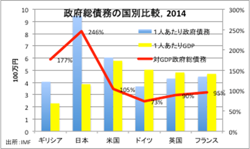 ギリシャの一般政府債務(国・地方・社会保障基金)残高の対GDP比は2014年で177%と高い数字になっているが、日本のそれは246%に達しており、もっと酷い。日本の場合、その債権者が国内にとどまっているので、政府はコントロール可能と言っているが、それはギリシャと違い国民の金で用立てた借金だから、最後は何とでもできると言っているにすぎない。決して、本質的に問題が解決できているわけではない。