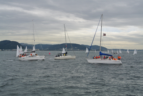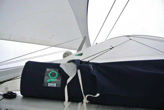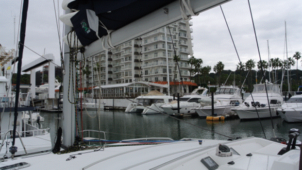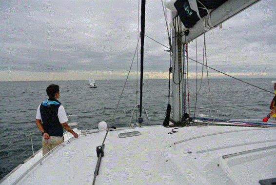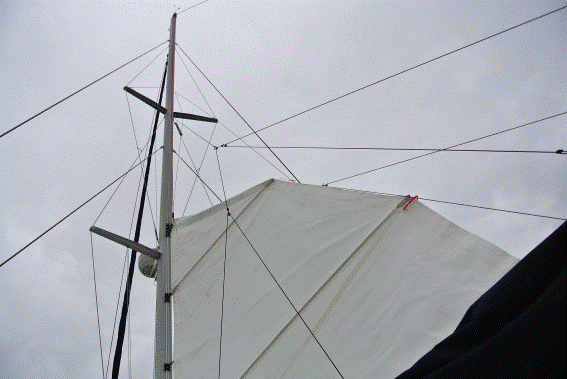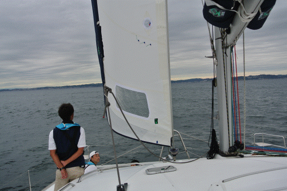マリーナか沖合に出て、帆を張り始めたところです。帆柱の先まで帆が上がれば、満帆。 |