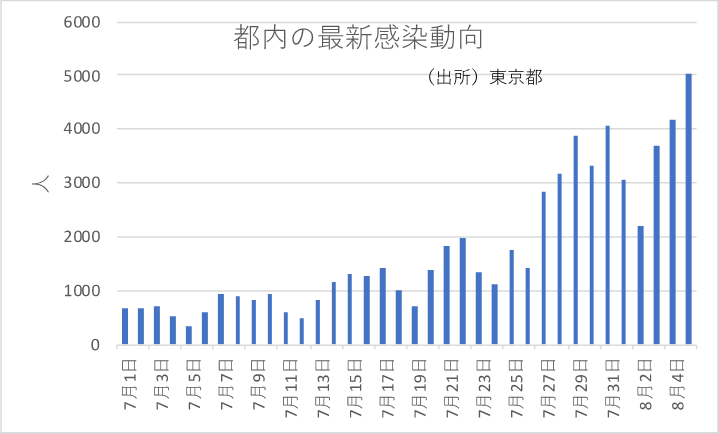 オリンピックが始まると同時に、コロナ感染者数が急増した。今日の都内の感染者数は5042名、初めて5000名を越えた。