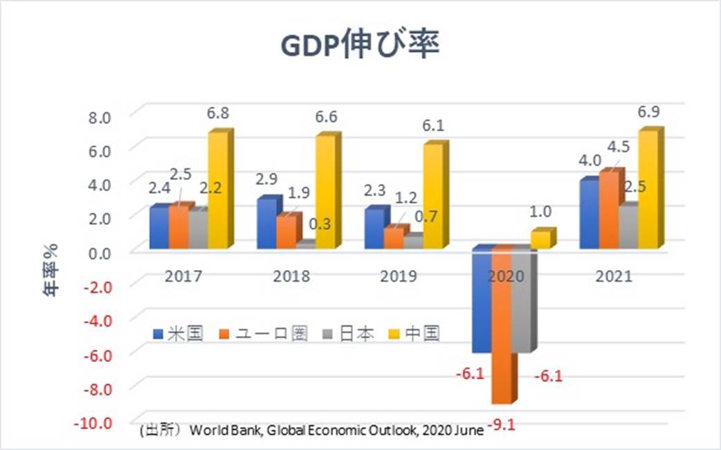 来年2021年には、米国が4.0%、ユーロ圏が4.5%の成長率で経済回復を予測するが、日本は2.5%と低い成長率にとどまる。現時点で既に経済回復の兆しを見せいている中国は6.9%の高い成長率を回復する。