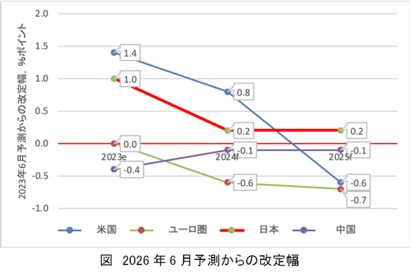 さて、日本はどうだろうか。2023年は昨年の予測から1.0%ポイント高い1.8%(推定)の成長であり、さほど悪くはない。しかし、2024年と2025年も0.2%ポイント上方修正され、それぞれ0.9%と0.8%成長と予測するものの、1%の成長率を越えることはない。