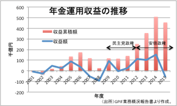 安倍政権、正確には第二次安倍政権が発足した2012年12月26日以降、株価は急速に値上がりし、年金の運用収益も順調に、いやいや順調どころか10%前後の運用益を上げてきた。昨年度は、中国の経済成長に陰りが出たこと、さらには英国がEU離脱を決めたことで、世界的に経済の先行きに陰りが出て、株価も落ち込んだ。その結果、5兆円の損失を出したというわけである。しかし、資金運用とは単年度の成果で一喜一憂すべきものではない。グラフを見れば明らかなように、この程度の損失の発生は過去にも経験したとおりである。