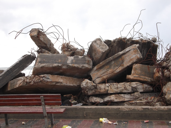 2014年のイスラエルの空爆で破壊された建物の残骸が、海辺のテトラポッドの上に積み上げられています。街中には、いまだに復興できていない建物があります。 |