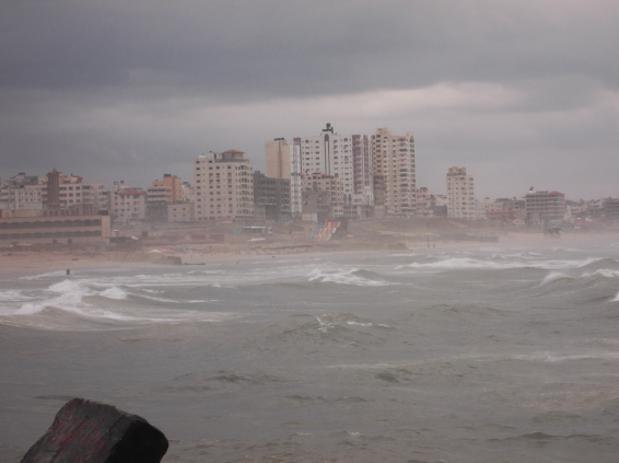 明け方の雨が未だ残こり、波しぶきが立ち上がっています。向こうに見えるのはガザの市街地です。 |