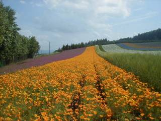 お目当てはファーム富田。様々な植生で毛氈のように色を塗り分けた畑は何度見ても感激します。かつて、一度は輸入の安い香水に押され、ラベンダー作りを諦めかけたという時代もあったそうですが、ここまで農場を発展させた富田さんの半生の歴史を知れば、誰でも感動します。
