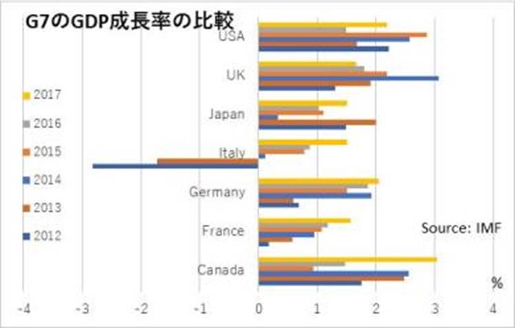 日本も威張れたものではない。2013年は2%に届いたものの、翌年は消費税の値上げで経済成長はドンと落ち込んだ。それ以降は、G7の中ではイタリアと並んで未だにドンケを争っている。現状は、やっとのことでプラス成長を保っているに過ぎない。