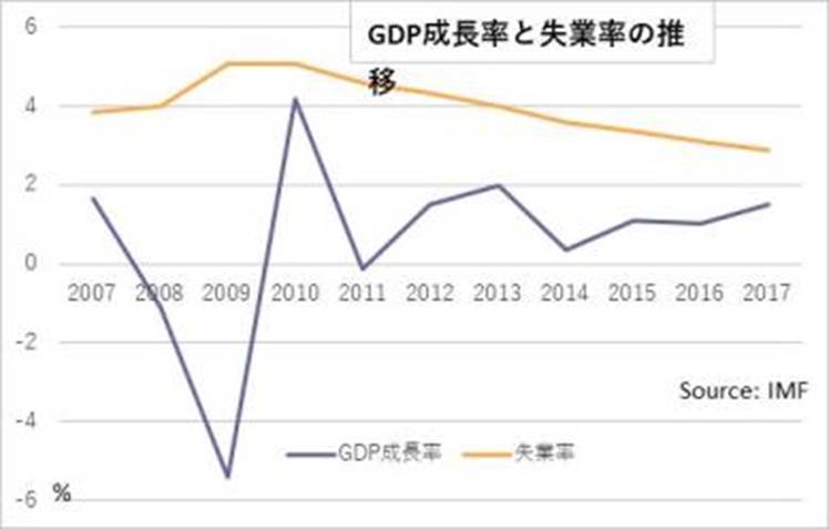 左のグラフは日本の経済成長率と失業率の推移を示したものである。リーマンショックで経済が落ち込んだ途端、失業率が跳ね上がった。このところ失業率が低下し続けているのは、年率2%には届かないものの、それでも安定的に経済が成長しているからである。