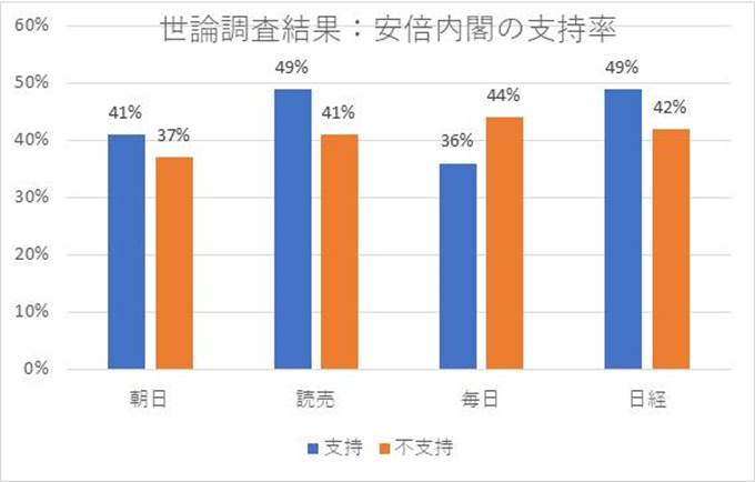 今朝の新聞各社は、安倍内閣支持率について世論調査結果を発表した。支持率は急速に下がり、いずれの結果も支持は50%を割り、不支持と拮抗してきた。