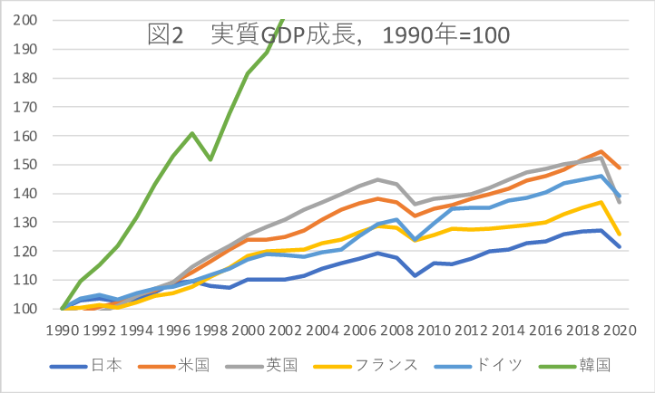 繰り返すが、これらの数字は名目GDPではなく、実質GDPで見ている。マスメディアでは、米国のGDPはこの間2.6倍に拡大し、英独仏のGDPもおよそ2倍になったが、日本は1.1倍に過ぎなかったという記事をよく見にする。しかし、これらの数字は名目値での比較である。