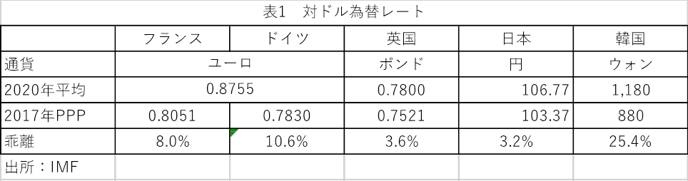 図1と図3の比較で分かるように、韓国がPPPを使った場合と市場為替レートを使った場合でこれほどの差が出るのは、PPPと市場の為替レートの間に大きな乖離があるためである。日本は両者の乖離は3.2%にすぎないが、韓国は25.4%と極めて大きい(表1参照)。