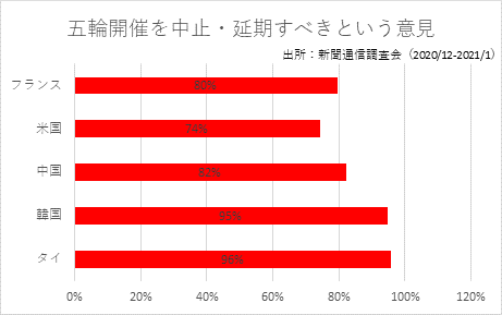 最近公表された世論調査の結果である。調査の実施者により数字のバラツキはあるものの、中止・延期という声が実施の声を大きく上回る。これは日本だけではない。海外でも開催中止・延期の声が多数を占める。いやはや、事ここに至れば、五輪に対する世間の目は冷たいものである。