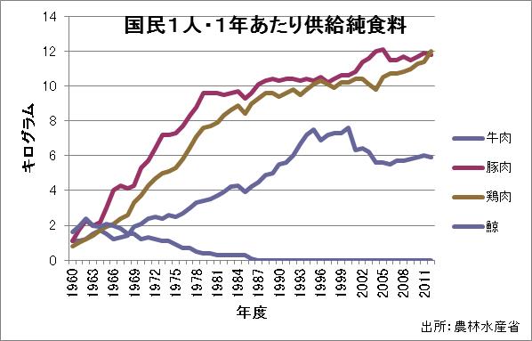今や鯨肉は一般家庭の食卓に上ることはまずない。日本人が鯨肉を重要なタンパク源としていたのは、1960年代で終わっている。鯨肉の国内消費量は、今や年間4000〜5000トン(推定)にすぎない。1人あたりに換算すれば、僅か30〜38グラムを食べているだけである。一方、牛肉の1人あたりの年間消費量は5.9キログラム、豚肉は11.8キログラム、鶏肉が12キログラムである(農林水産省食糧需給表,2012年度)。食料としての意味はほとんど消えてしまった。