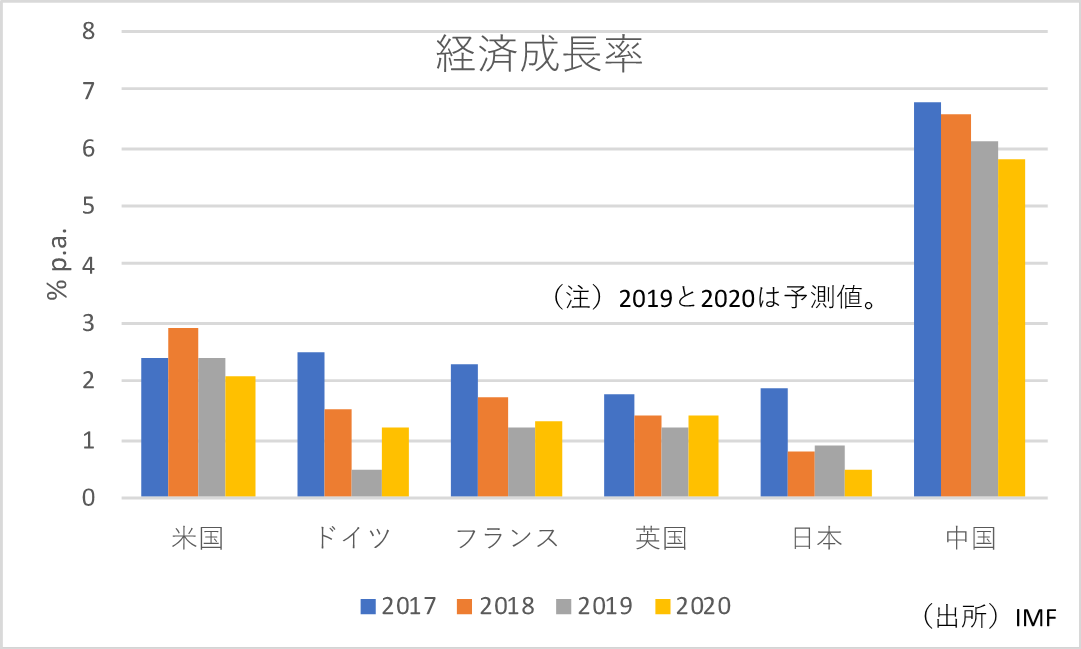 このような景気の落ち込みは、米中ばかりではない。IMFの予測では、EUユーロ圏のGDP成長率は今年が1.2%、来年が1.4%である。日本は今年が0.9%、来年は0.5%と、先進国中最も低くなると見られる。